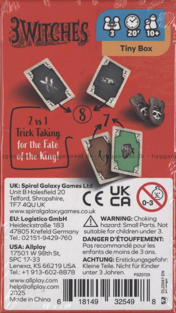 Kommunikationen mellem medbryggere er begrænset til overordnede drøftelser om, hvorvidt de bør forsøge at vinde eller tabe et stik, hvilket skaber spænding og taktisk dybde i hver eneste runde. 3 Witches forener budgivning, samarbejde og skjulte kort i et hurtigt og intenst spil med magisk atmosfære og høj genspilningsværdi.
