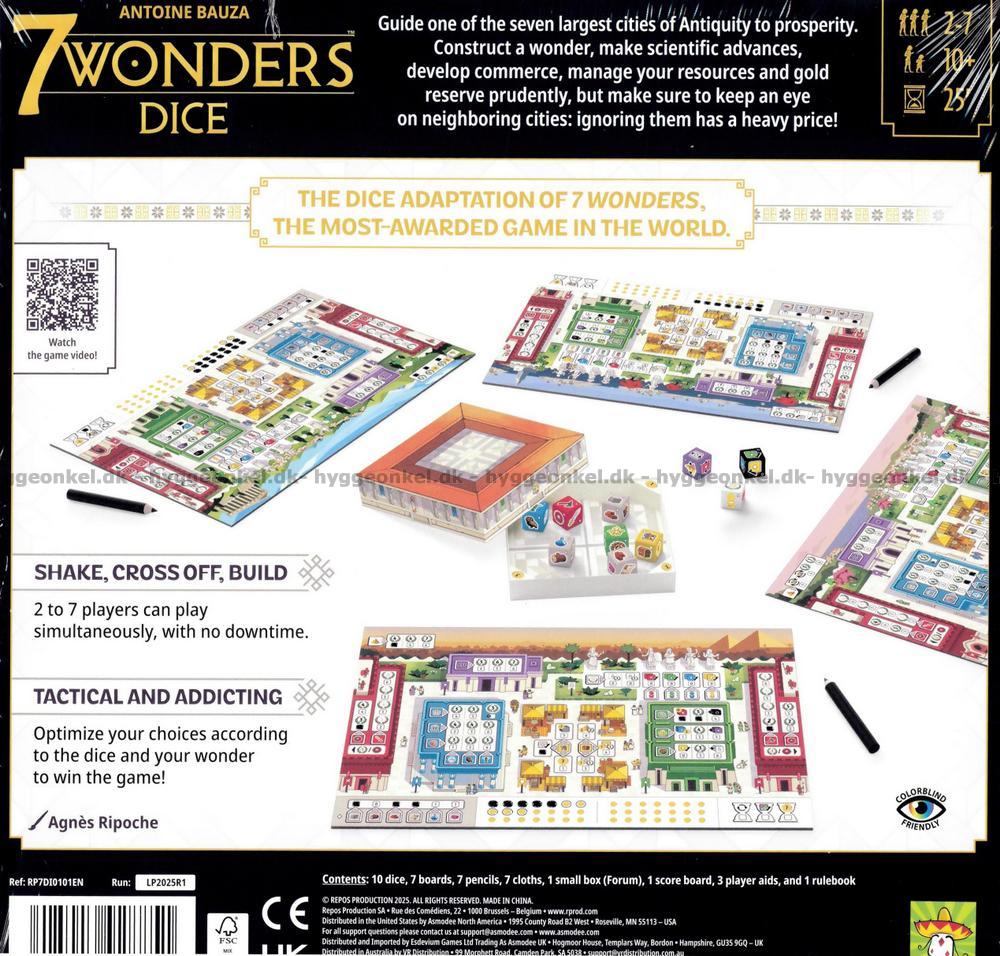 Spillet kombinerer den klassiske 7 Wonders-stemning med en ny og hurtig rytme, hvor planlægning møder tilfældighed. I stedet for kort bruger du terninger til at bygge din by, og hvert kast åbner for nye valg. Skal du investere i markeder og guldreserver for at sikre stabilitet? Eller satse på universitetet og videnskaben for at opnå langsigtet dominans? Du kan også bygge dit storslåede vidunder – uden at bruge terninger – og få adgang til særlige evner, der ændrer spillets gang.