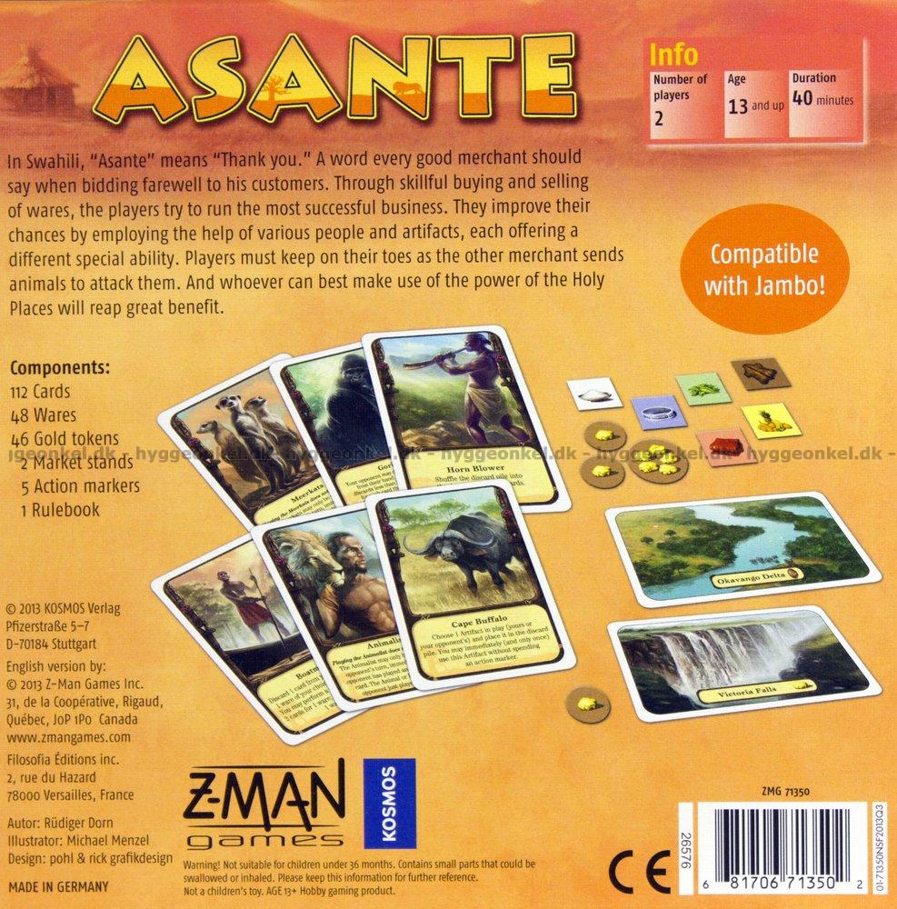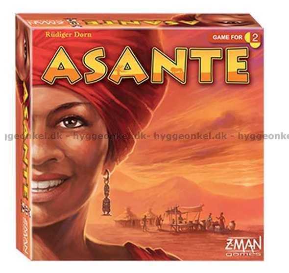 Asante er et to-personers spil, som foregår i samme verden som Jambo og Waka Waka (spillet kan faktisk kombineres med Jambo hvis man ønsker det).
