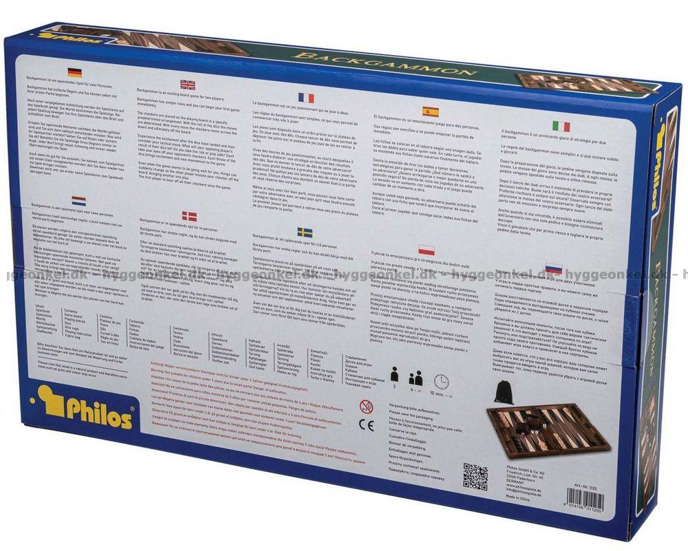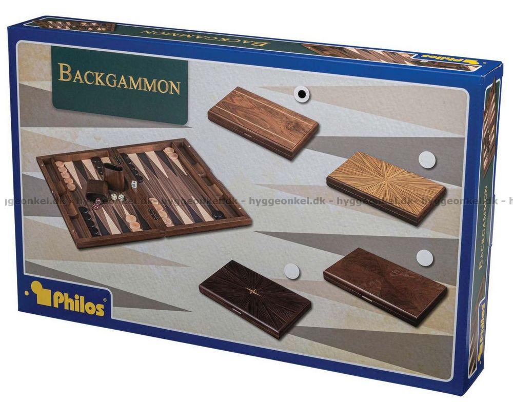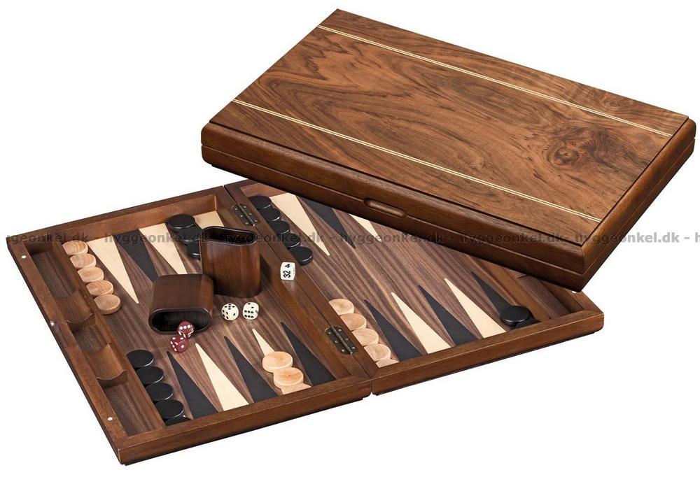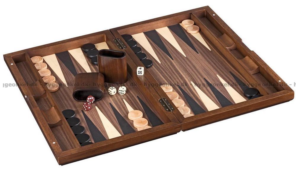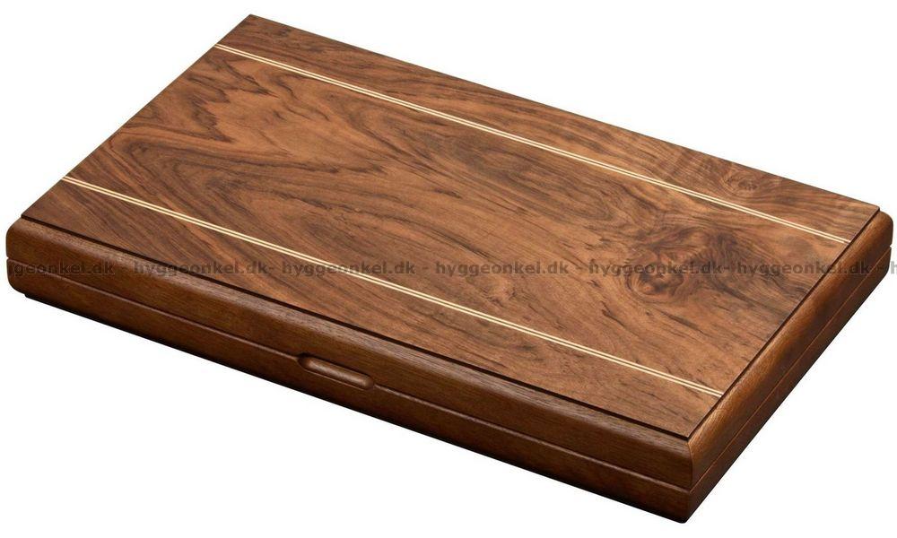 Æsken indeholder et spil backgammon samt brikker, terninger og raflebægre.
