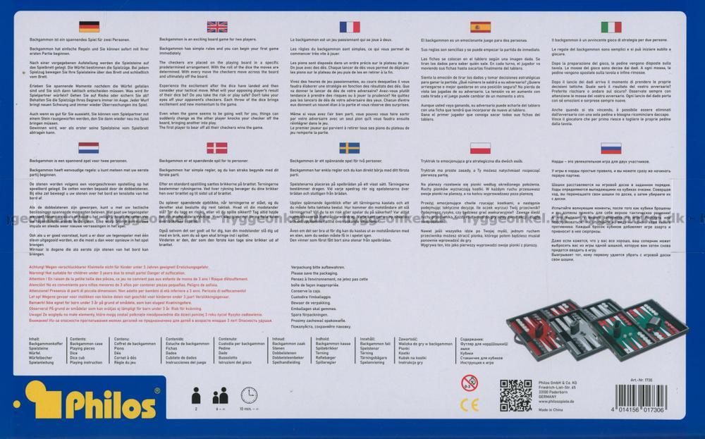 Æsken indeholder et spil backgammon samt brikker, terninger og raflebægre.