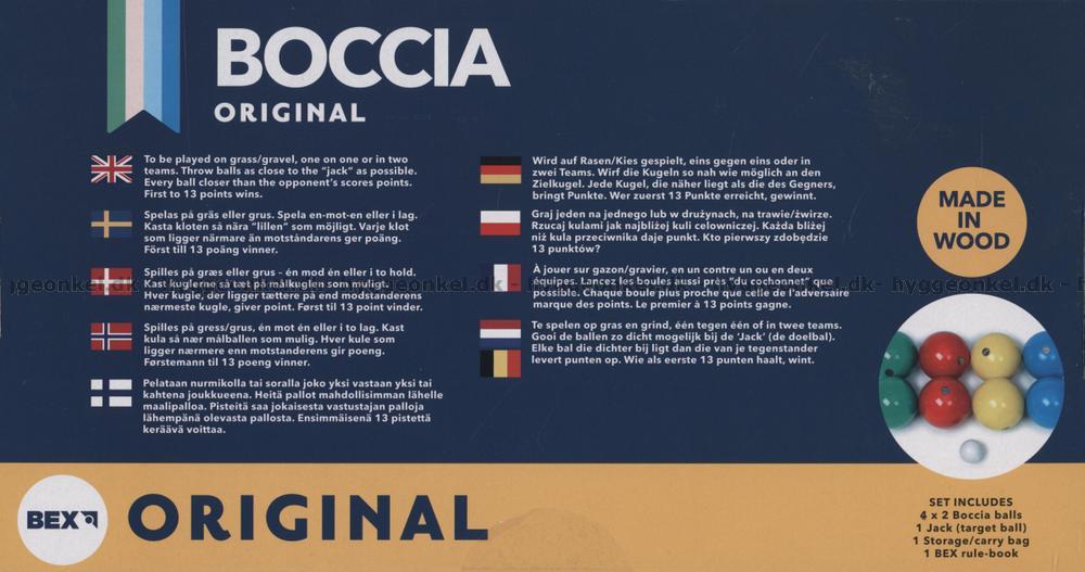 Boccia er et klassisk kuglespil, hvor målet er at placere sine kugler så tæt på en lille målkugle som muligt. Spillet starter med, at en spiller kaster målkuglen ud på banen, hvorefter spillerne skiftes til at kaste deres egne kugler. Den spiller eller det hold, der ikke ligger tættest på målkuglen, fortsætter med at kaste, indtil de enten overtager den bedste placering eller løber tør for kugler.