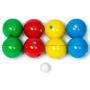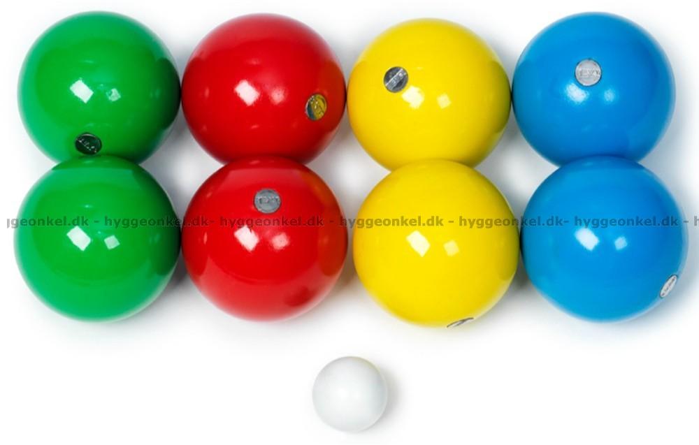 Du får 8 trækugler (2 i hver farve). Hver kugle har en diameter på ca 72 mm. De vejer ca 200 gram. Derudover en hvid "gris" og en opbevaringspose.