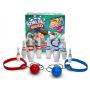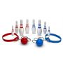1 rødt pandebånd med en kugle på en snor, 4 røde bowlingkegler af forskellig størrelse, 1 blåt pandebånd med en kugle på en snor og 4 blå bowlingkegler af forskellig størrelse.