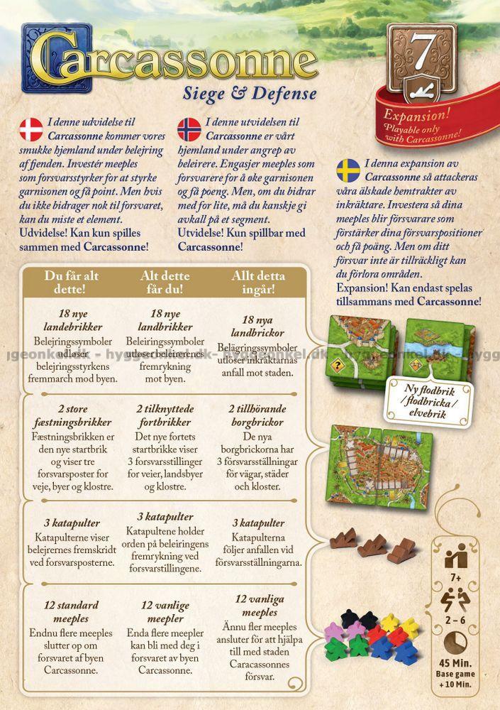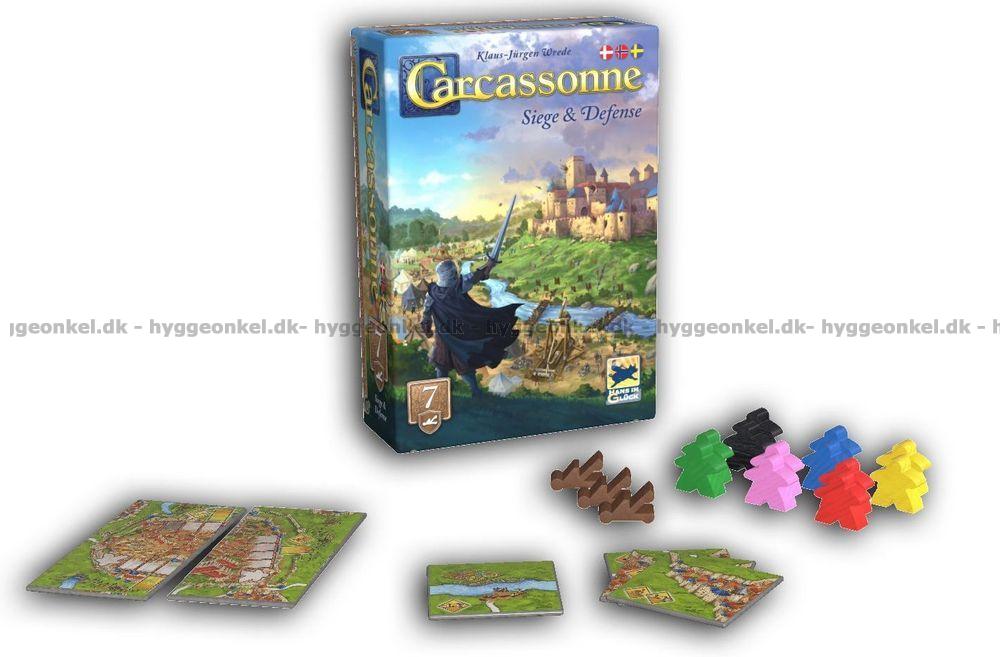 Carcassonne Udvidelse 7: Siege & Defense giver grundspillet et nyt fælles element, som alle spillere hele tiden skal forholde sig til: en central fæstning, der er under angreb gennem hele spillet. I praksis betyder det, at der løbende kan opstå situationer, hvor “angriberne” presser på, og hvor spillerne kan vælge at styrke forsvaret for at få fordele og point ud af det.