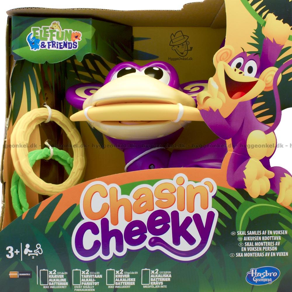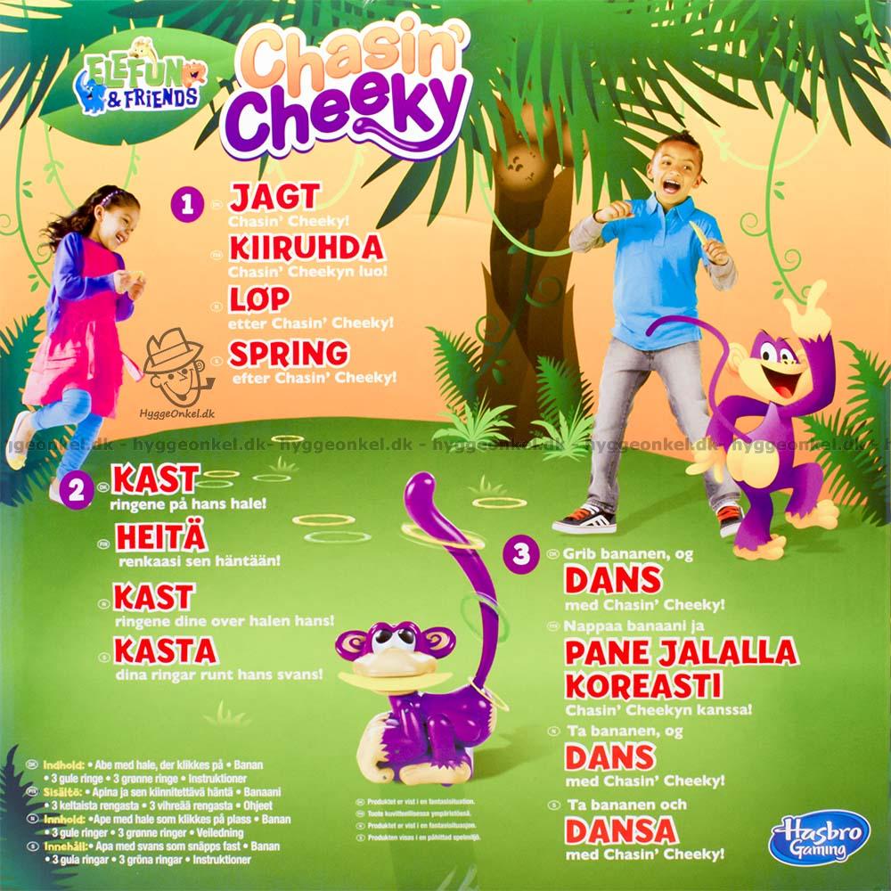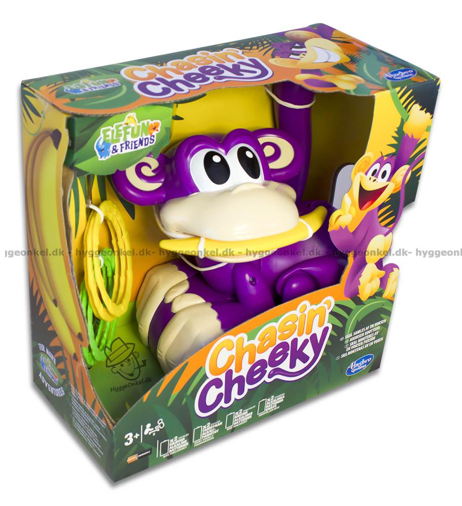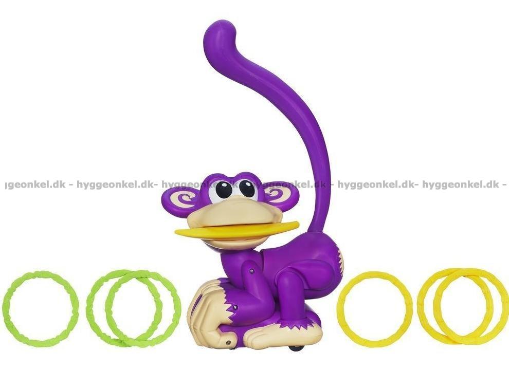 I æsken finder du den frække abe (ca. 25 x 20 cm) - 1 banan - 3 gule ringe - 3 grønne ringe - spilleregler.
