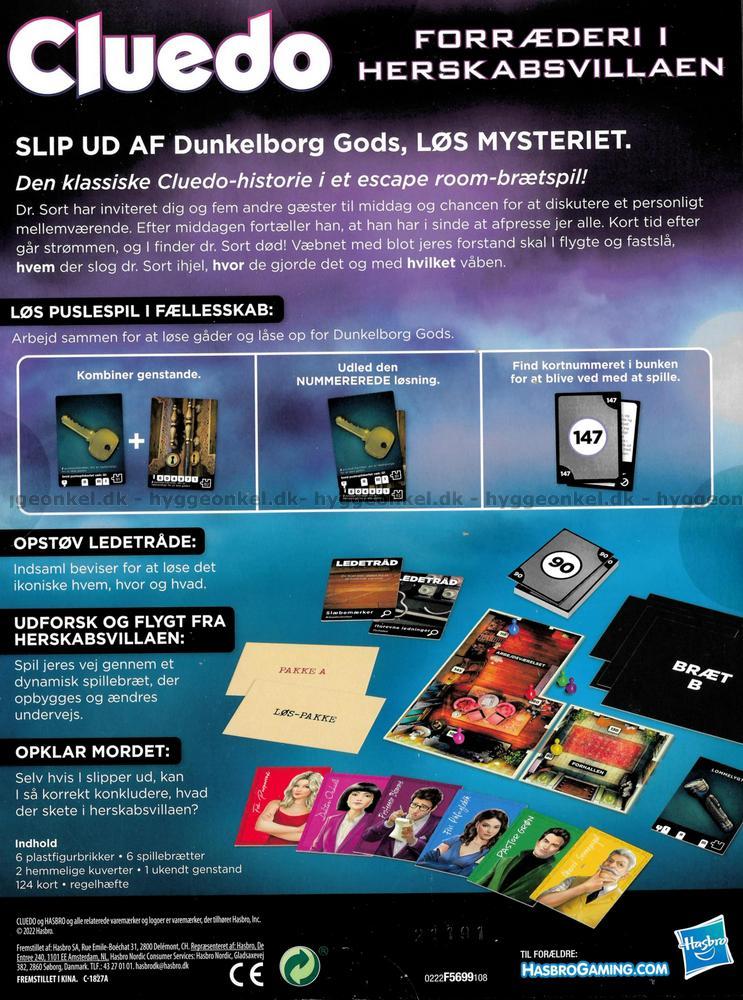6 plastikfigurbrikker, 6 spillebrætter, 2 hemmelige kuverter, 1 ukendt genstand og 124 kort.