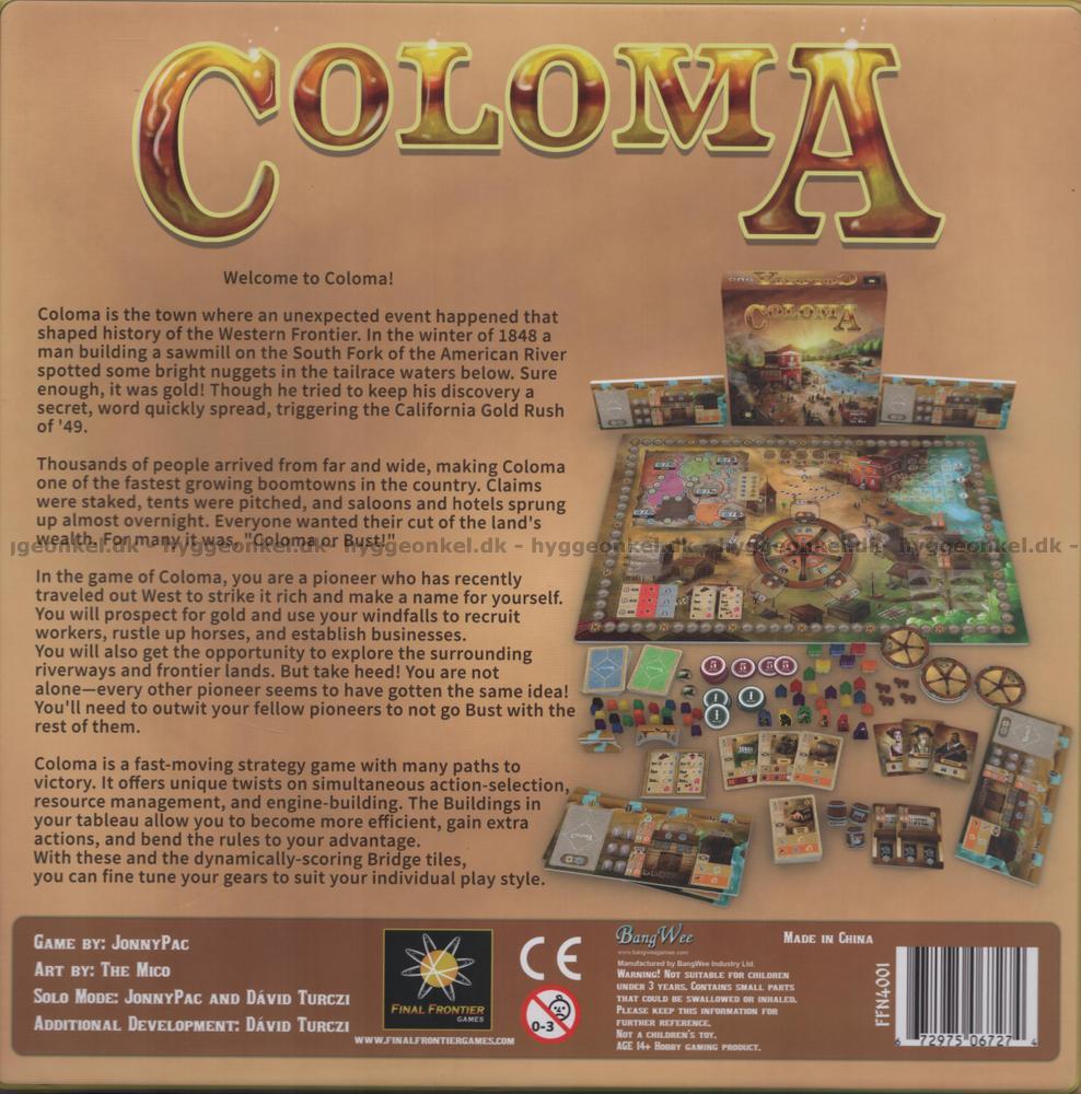 I Coloma spiller du en af de mange pionerer, som har søgt lykken vestpå. Du skal forsøge ud fra en række forskellige handlinger i spillet at opbygge en god forretning. Der skal fx samles ressourcer, bygges broer, placeres lejre og pistolmænd.