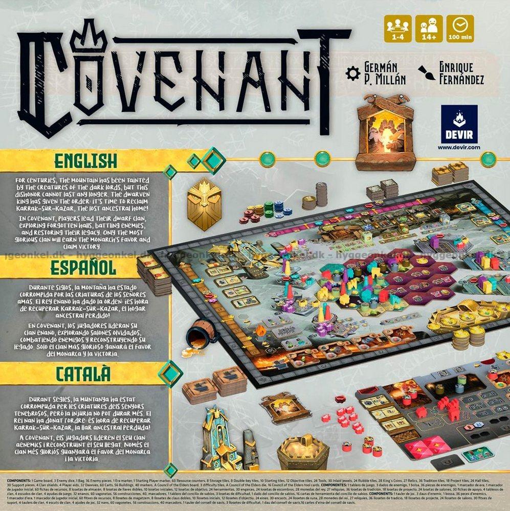 Covenant er et storslået fantasybrætspil, hvor dværgenes konge kalder klanerne sammen for at generobre Karrak-sür-Kazar – det hellige bjerg og dværgenes ældgamle hjem. I århundreder har mørkets herrer og deres håndlangere indtaget hallerne, men nu vender dværgene tilbage for at drive fjenden ud og genopbygge det, der engang var deres stolthed.
