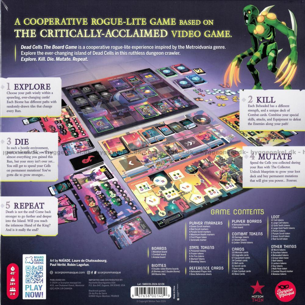 Dead Cells: The Rogue-Lite Board Game er et brætspil baseret på det computerspillet af samme navn. Du vågner til bevidsthed i en fugtig fangehule, omgivet af mørke korridorer, muterede væsner og en gennemtrængende lugt af død. Du ved ikke, hvorfor du er her – men én ting står klart: du må kæmpe dig op gennem dette fordærvede fængsel, ét rum ad gangen, for at slippe fri. Undervejs samler du våben, skatte og runer, kæmper mod monstrøse fjender og mægtige bosser som The Hand of the King, mens du bliver stærkere for hver tur, du overlever.