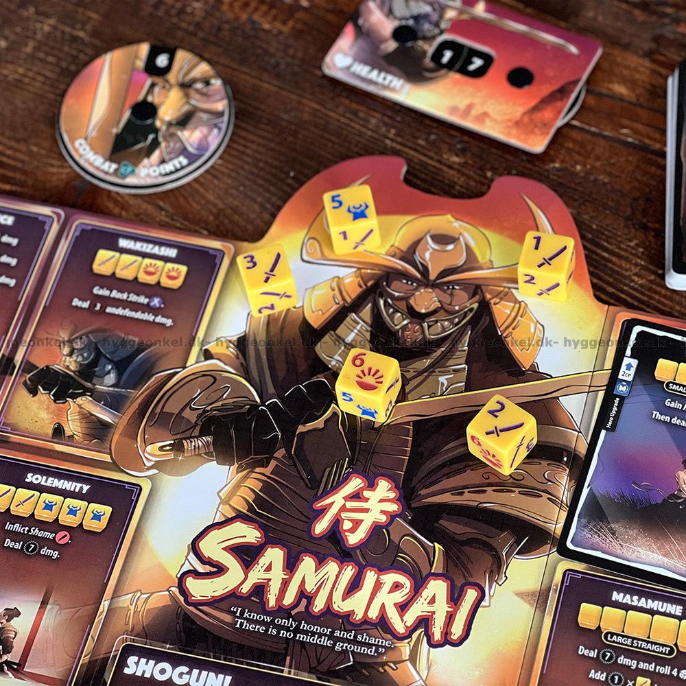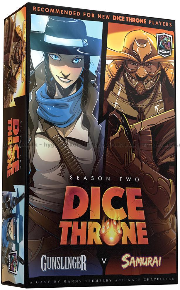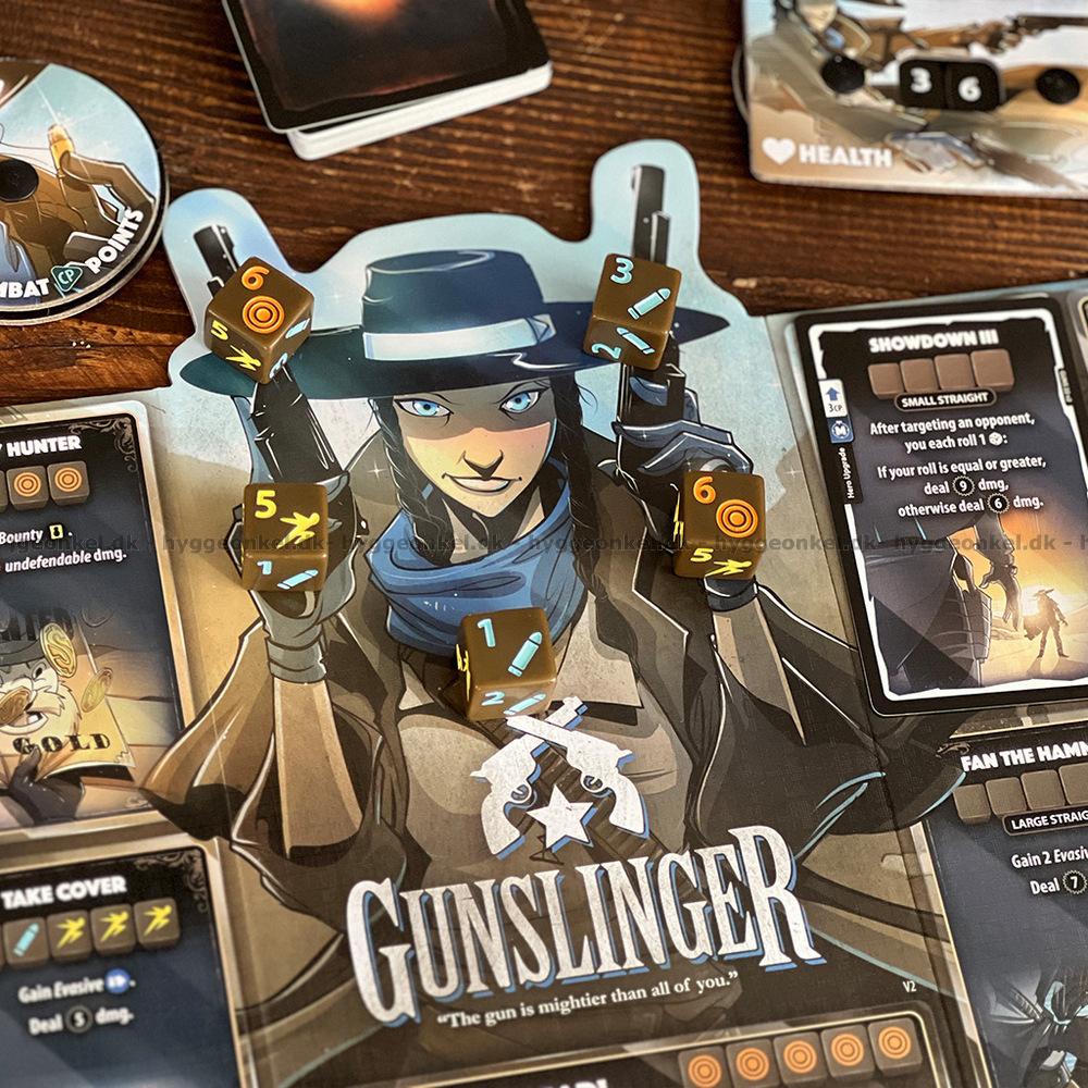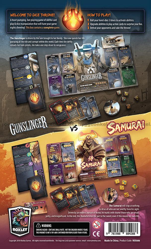 Dice Throne: Gunslinger vs Samurai sætter scenen for en dynamisk duel, hvor hævnens kraft møder ære og disciplin i et visuelt og taktisk spændende opgør. Gunslingeren angriber med lynhurtige pistolskud, hårdtslående bounties og styrkende reloads, mens Samuraiens rolige fokus gør ham i stand til at påføre Shame og vende situationen med præcise, æresdrevne slag.