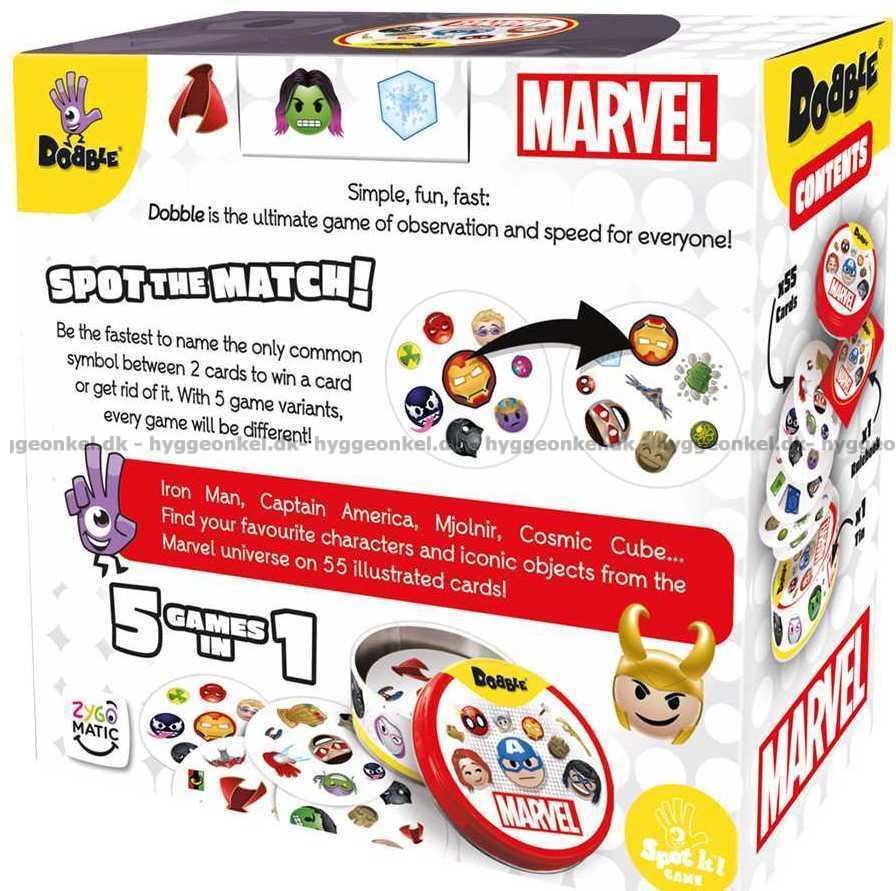 Dobble: Marvel kombinerer det populære Dobble med helte og skurke fra Marvel-universet. Kortene er fyldt med velkendte figurer, som gør spillet ekstra levende og let genkendeligt.