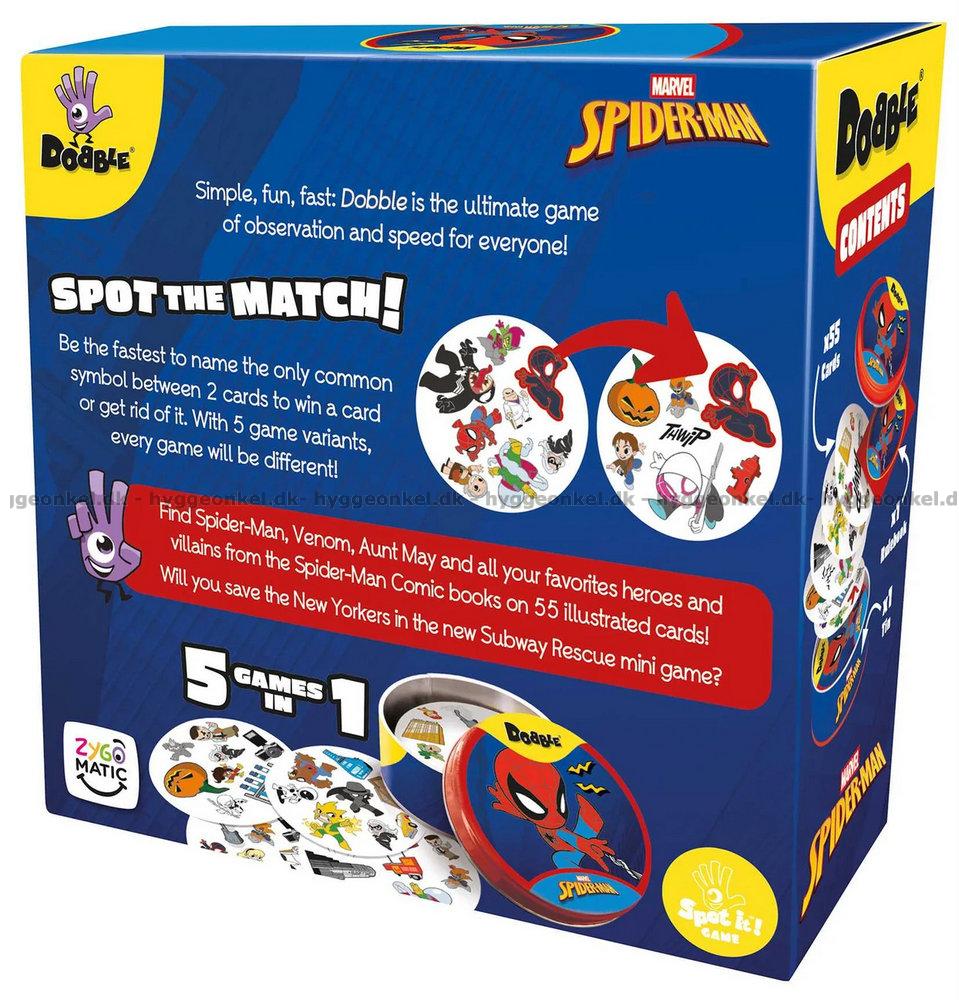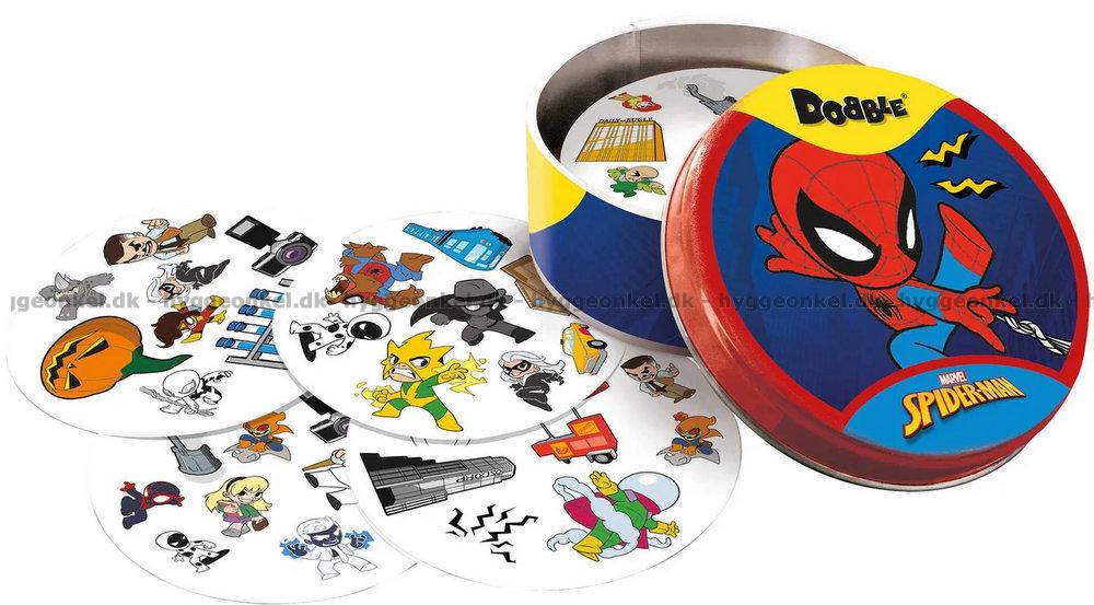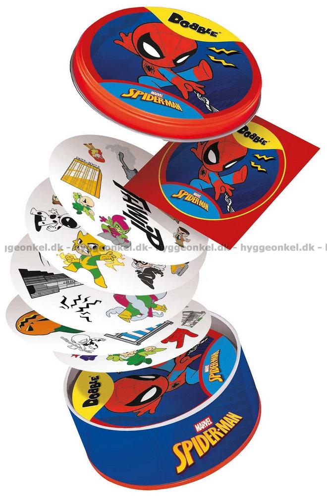 I denne udgave af Dobble er motiverne hentet fra Spider-Man universet.