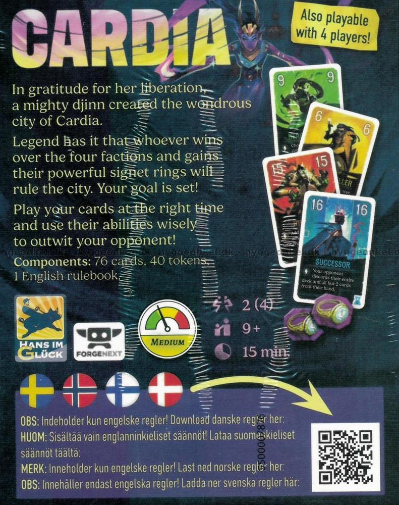 I Duel for Cardia træder du ind i en magisk og konfliktfyldt verden, hvor fire unikke fraktioner kæmper om kontrollen over byen Cardia – en by opstået af venskabet mellem en ung eventyrer og en mægtig djinn. Oprørere fra sumpen, lærde fra Akademiet, mekaniske opfindere i Gildet og den gamle kongeslægt i Dynastiet tørner sammen i et intenst kortspil, hvor taktik og timing er alt.