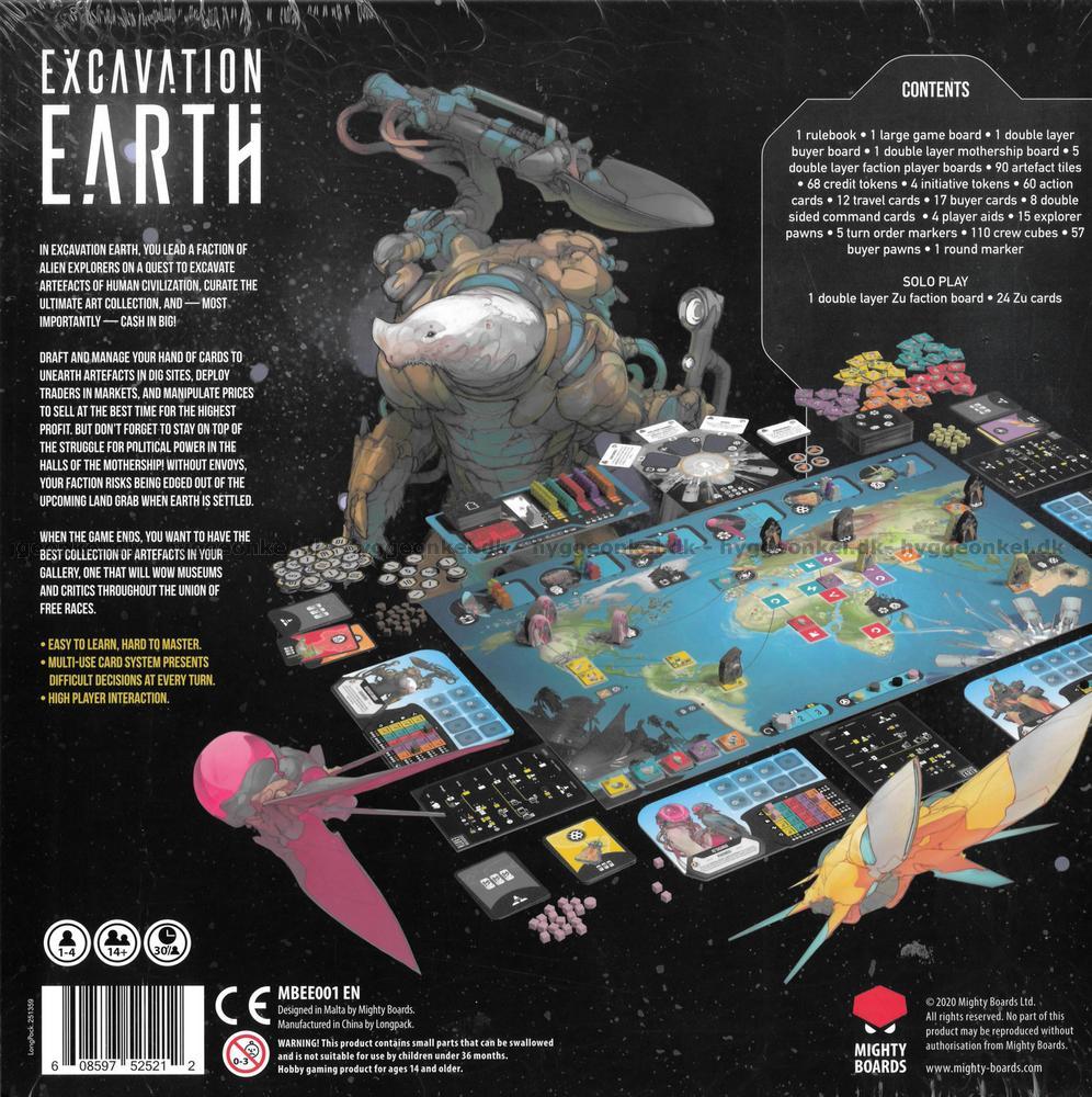 Ved at bruge dine handlinger effektivt og tilpasse dig markedsændringer kan du få flere kreditter, og spillet slutter efter tre runder, hvor spilleren med flest kreditter bliver den ultimative samler. "Excavation Earth" kombinerer spænding og strategi i en verden, hvor hver beslutning påvirker dine chancer for succes som en galaktisk opdagelsesrejsende og kunstsamler.
