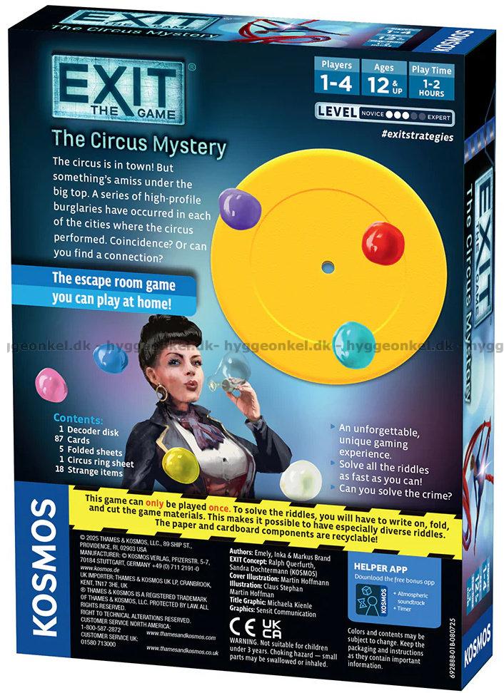 Træd ind i en verden af mystik, farver og skjulte hemmeligheder med Exit: The Circus Mystery, hvor et omrejsende cirkus danner rammen om en nervepirrende efterforskning. En række sofistikerede indbrud har rystet landet, og én fællesnævner går igen: hver gang har det karismatiske Circus Spettacolo været i byen. Tilfældighed eller noget langt mere udspekuleret?