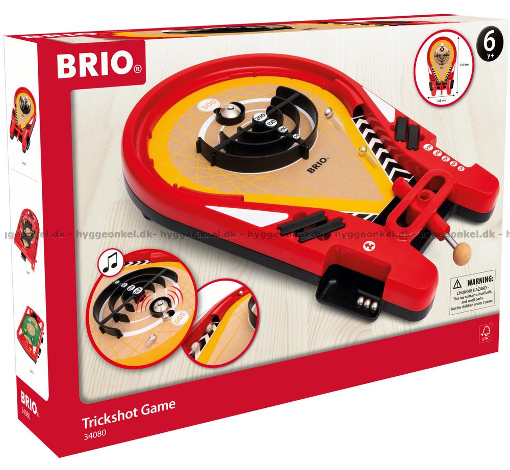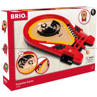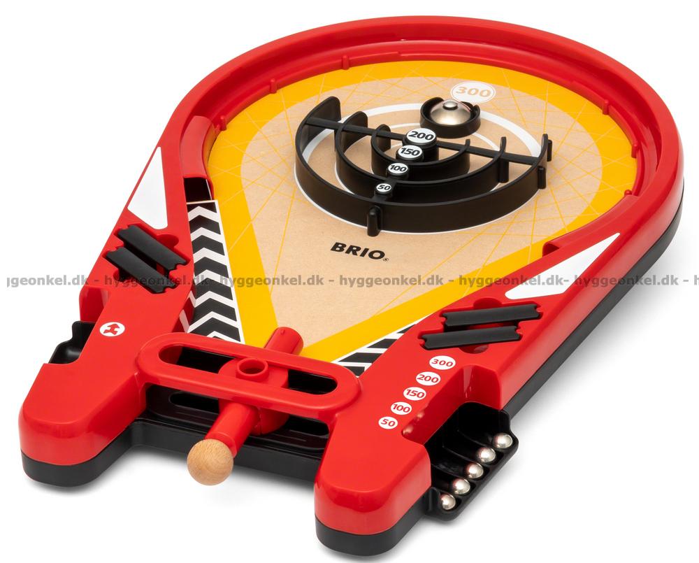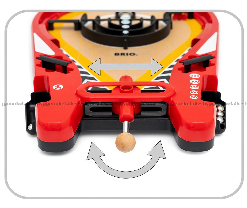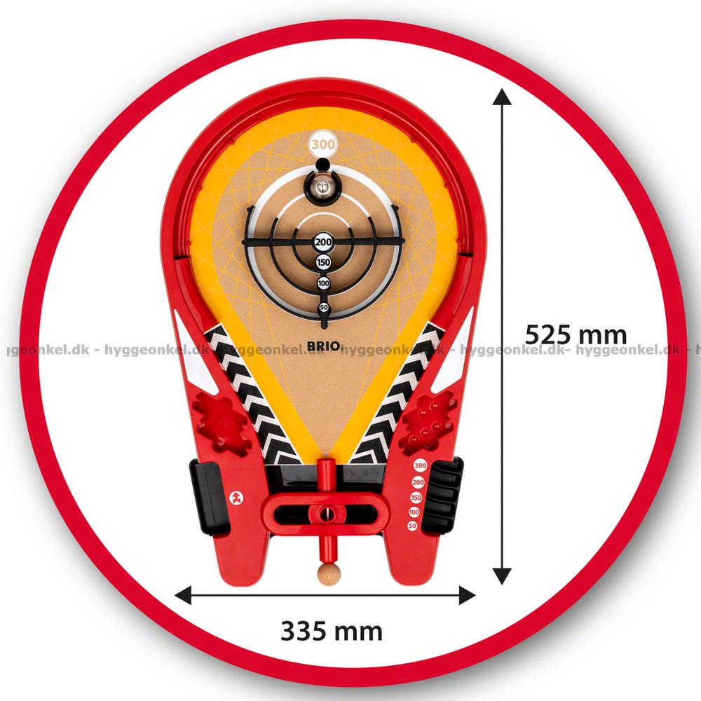 Nede i æsken finder du et flipperspil i plastik og træ. Det måler ca. 50 x 30 x 5 cm. Derudover medfølger metalkugle.
