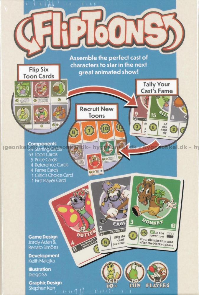 Fliptoons er et kreativt og humoristisk spil, hvor spillerne sammen skaber skøre tegneseriefigurer og konkurrerer om at samle de mest underholdende kombinationer. Hvert kort er illustreret med en del af en figur – hoved, krop eller ben – og ved at vende og kombinere kortene opstår der unikke karakterer fulde af sjove detaljer.