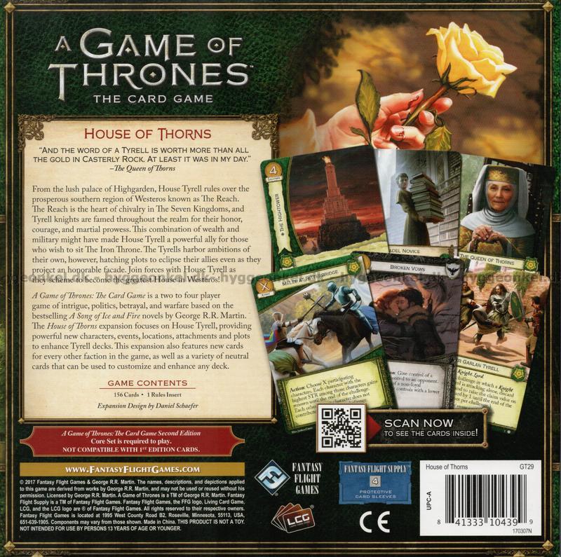 I denne udvidelse til Game of Thrones LCG er der fokus på Tyrell familien, der bor i Highgarden. De er en af de vigtige familier i Westeros.