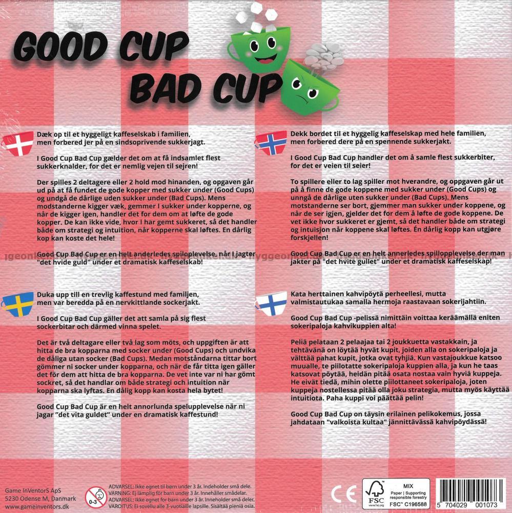 Dæk op til det store kaffebord og gør dig klar til en nervepirrende dyst for hele familien med Good Cup Bad Cup. Her kan I spille enten én mod én eller i hold mod hinanden, og kampen står om noget så sødt som sukkerknalder. Mens modstanderne kigger væk, gemmer du sukker under kopperne, og når blikkene igen rettes mod bordet, gælder det om at vælge rigtigt. Vælger du forkert, risikerer du at forære sukkeret til de andre, og dermed tipper balancen i spillet. Det er et spil, der holder alle på tæerne, hvor timing og mavefornemmelse kan være afgørende, og hvor dramaet altid er serveret sammen med kaffen.