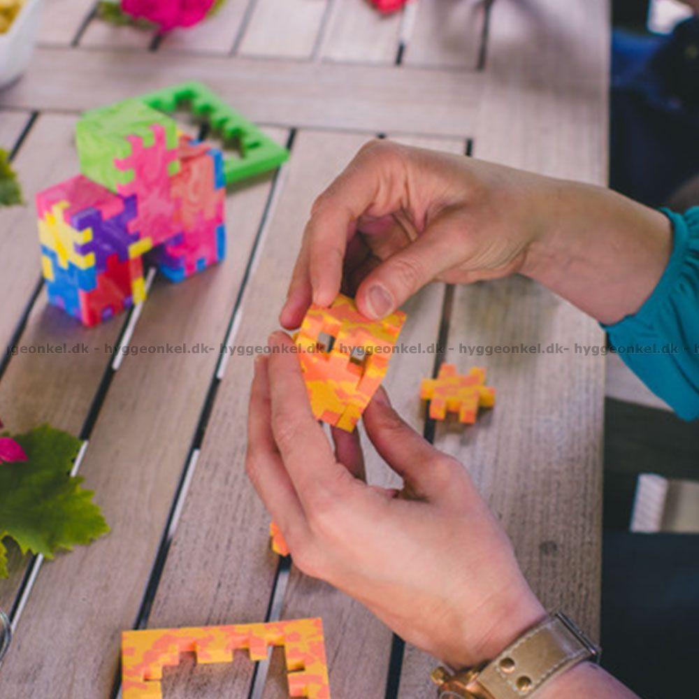 6 skum-kuber. Hver kube består af 6 brikker. Kuberne måler ca 4 x 4 cm, når de samlet.