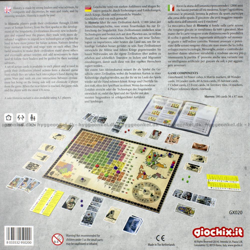 Historia er et civilisationsspil for 1-5 spillere, der er nemt at lære og spille. Det tager ca. 25 minutter per spiller, og der er håndmanagement, simultane handlingsvalg og kun begrænset ventetid.