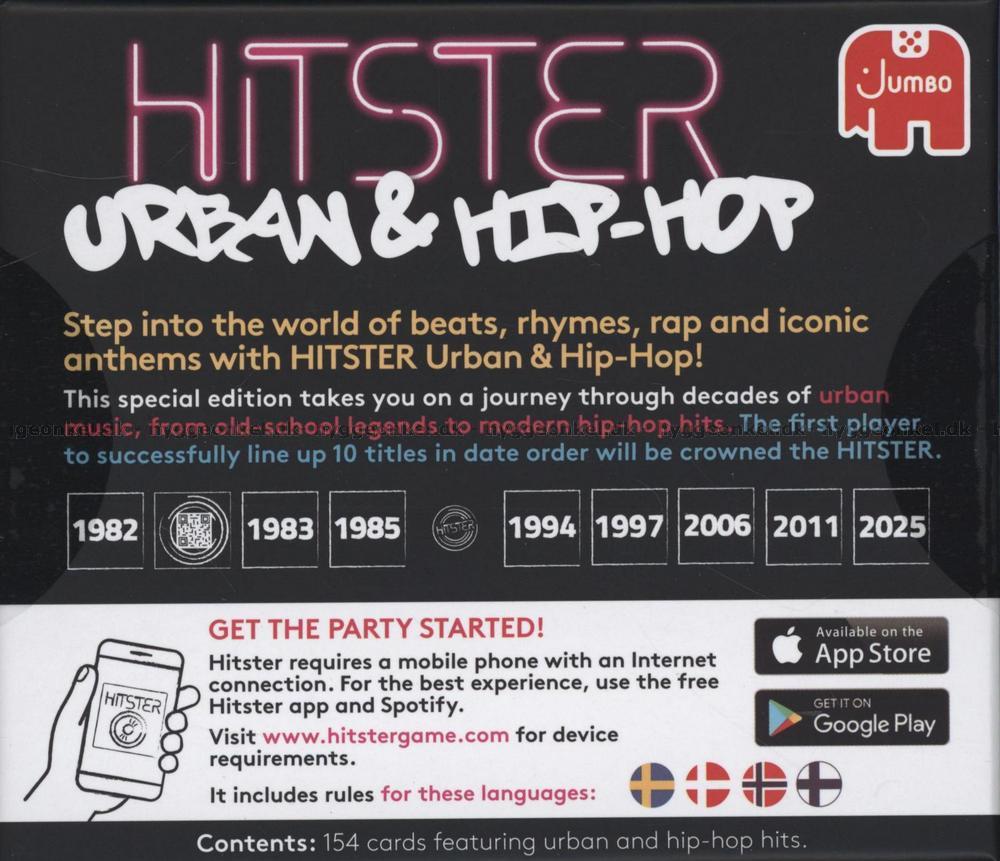 Hitster: Urban & Hip-Hop er en energifyldt og festklar udgave af det populære Hitster-spil, hvor musikken er omdrejningspunktet, og stemningen hurtigt ryger i top. Her træder I ind i en verden af beats, rim, rap og ikoniske anthems og sendes på en musikalsk rejse gennem årtier med urbanmusik – fra old school-legender til moderne hiphop-hits, der stadig dominerer hitlisterne.