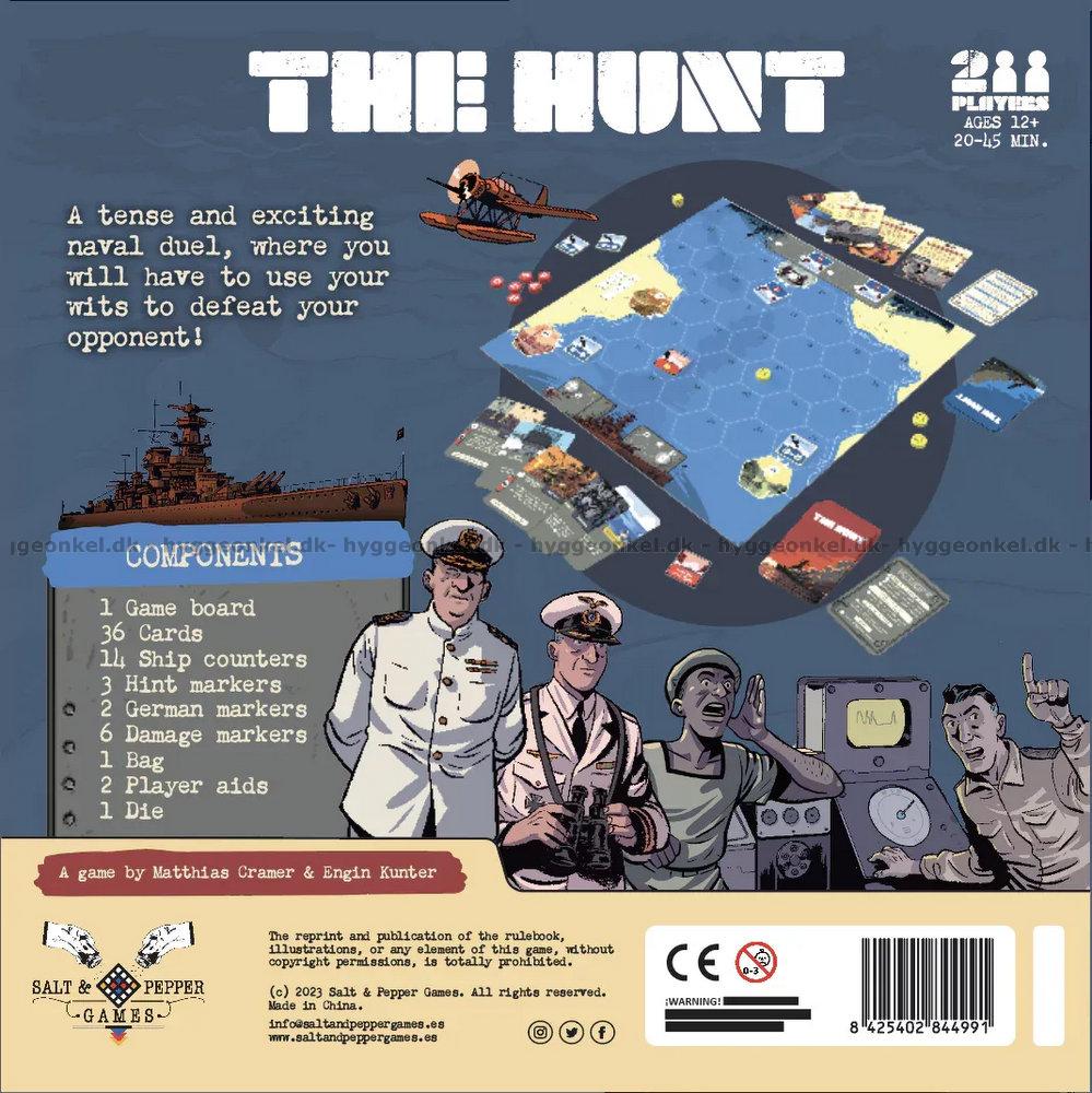 Hunt er et spil fyldt med historisk atmosfære, spænding og taktisk dybde – et nervepirrende kapløb mellem jagt og overlevelse, hvor hvert kort og hver beslutning kan ændre krigens gang.