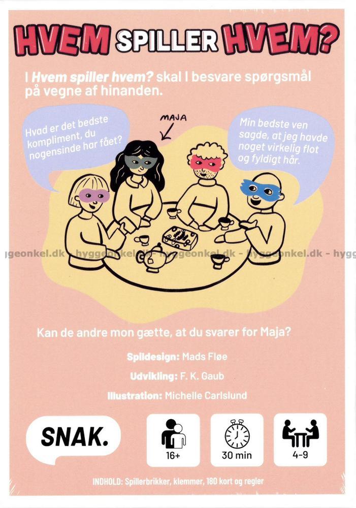 I Hvem spiller hvem? bliver hver spiller tildelt en hemmelig rolle – en af de andre ved bordet. Herefter gælder det om at svare på spørgsmål, ikke som dig selv, men som den person, du spiller. Det lyder nemt, men det bliver hurtigt både sjovt og forvirrende, når svarene begynder at afsløre – eller skjule – hvem der gemmer sig bag hvem. Når alle spørgsmål er besvaret, skal I gætte, hvem der spillede hvem, og pointene deles mellem dem, der både har gennemskuet og bedraget bedst. Du scorer point ved at gætte rigtigt på andres roller, men også ved at få nogen – men ikke alle! – til at tro, de har gættet din. Hvem spiller hvem? er et skarpt, socialt og overraskende underholdende spil, der tester både din intuition og din evne til at tænke som en anden.