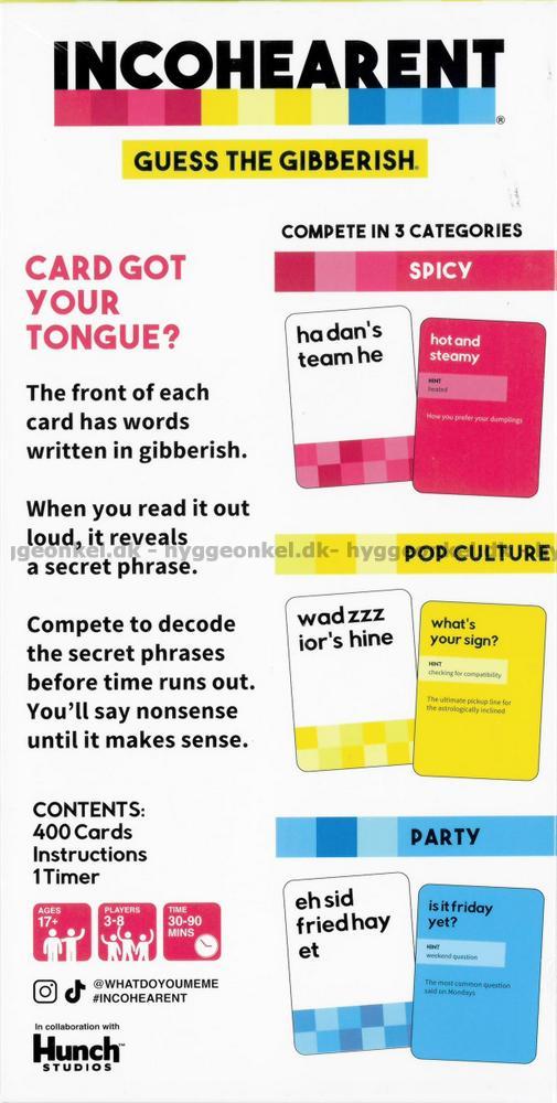 I Incohearant står der på hvert kort nogle ord eller en sætning, som indeholder et skjult budskab. Dette budskab kommer (måske) frem, når ordene siges højt.