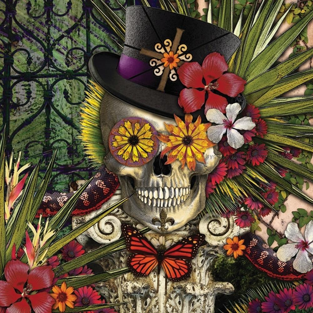 - Kraniet er dekoreret med blomster og en sommerfugl. Kraniet bærer en sort hat med lilla bånd og et dekorativt kors