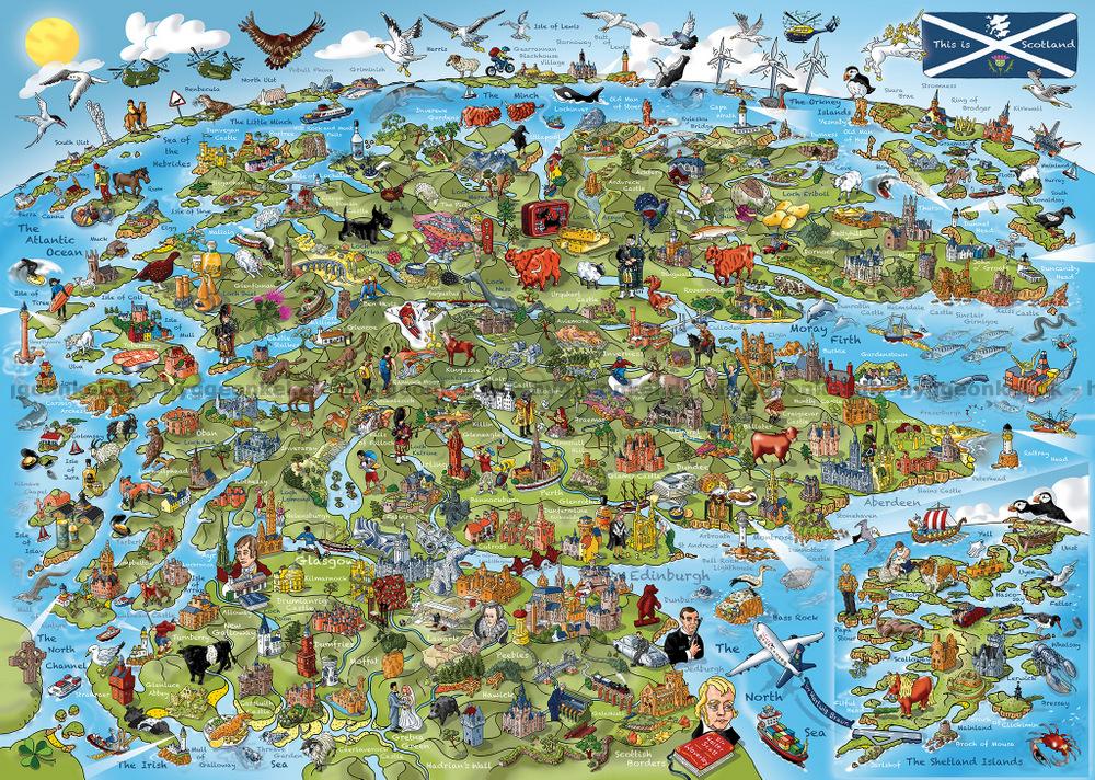 - Farverigt tegnet kort over Skotland. Her møder du både Højlandskvæg og Loch Ness uhyret