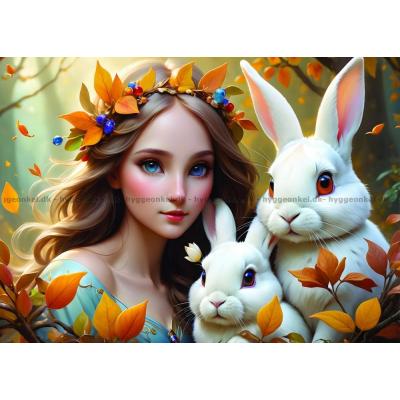 - Kvinden ude i skoven sammen med 2 hvide kaniner