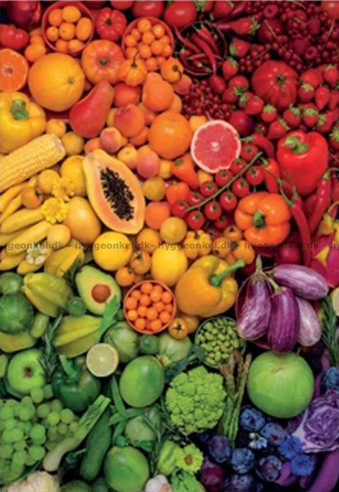 - De flotte og farverige frugter og grøntsager arrangeret som en regnbue