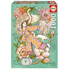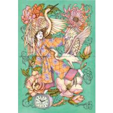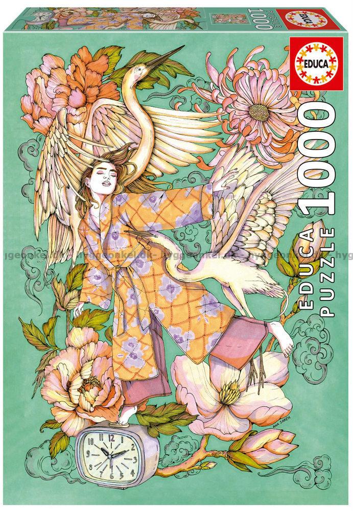 - Kvinden i den smukke kimono i en spændende dans med tranerne