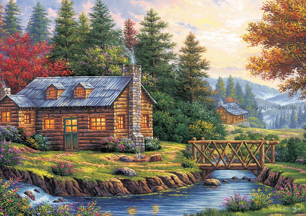 - Den charmerende bjælkehytte omfavnes af efterårets varme farver