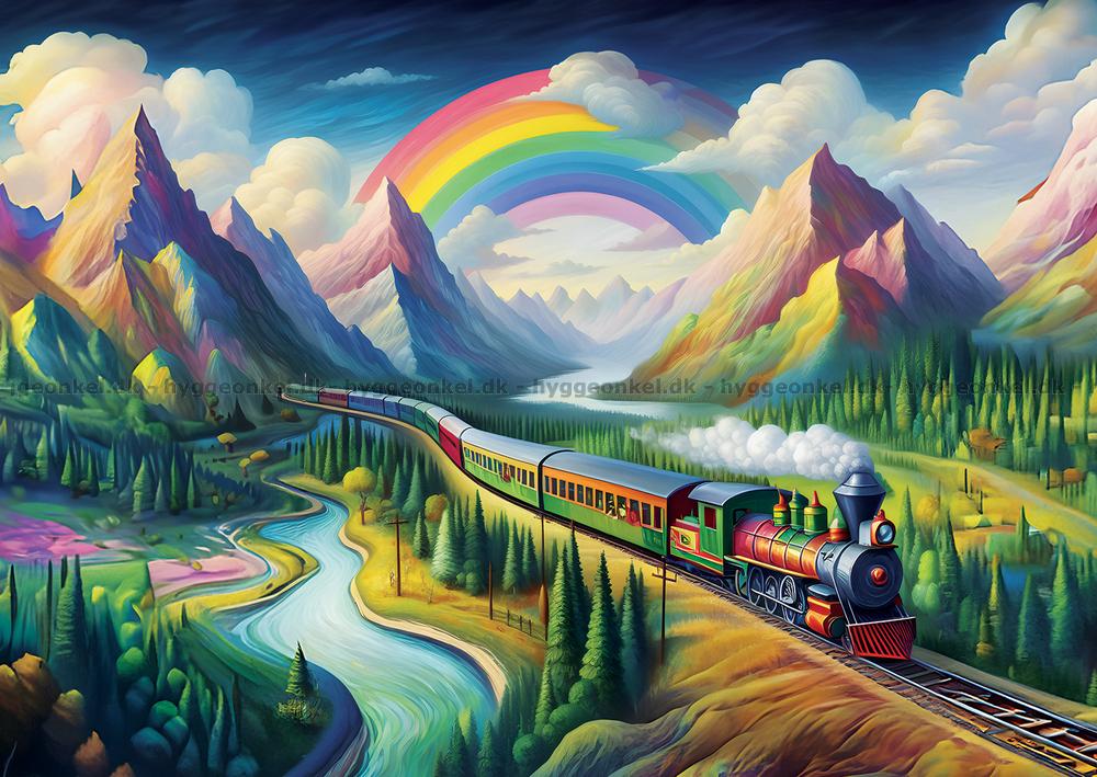 - Toget kører gennem det maleriske landskab. En stor, lysende regnbue danner bro mellem bjergene