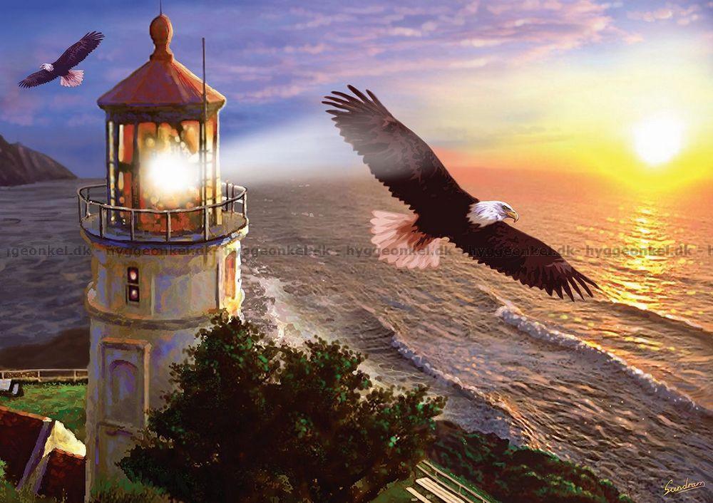 - Det majestætiske fyrtårn står ved kysten og kaster sit lys ud over havet. Over flyder en storslået ørn