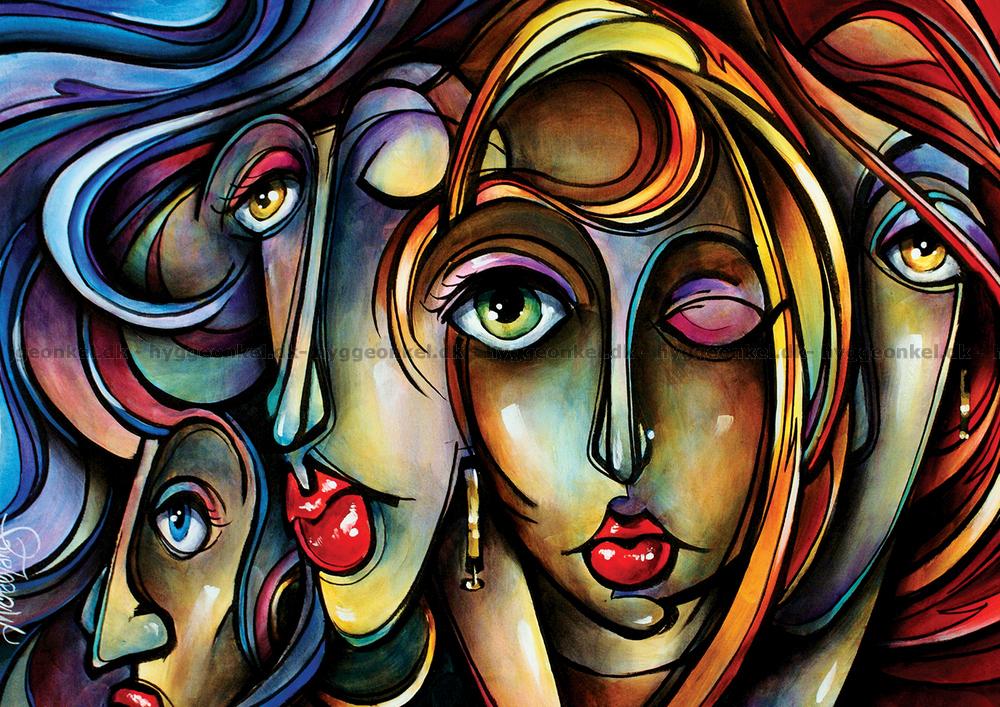- Spændende, abstrakte ansigter tæt sammenflettet. Ansigterne er malet med store, udtryksfulde øjne