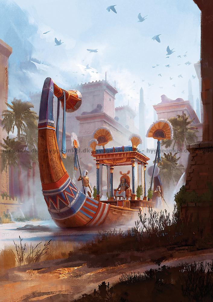 - I midten af den storslåede båd sidder en farao under en storslået baldakin