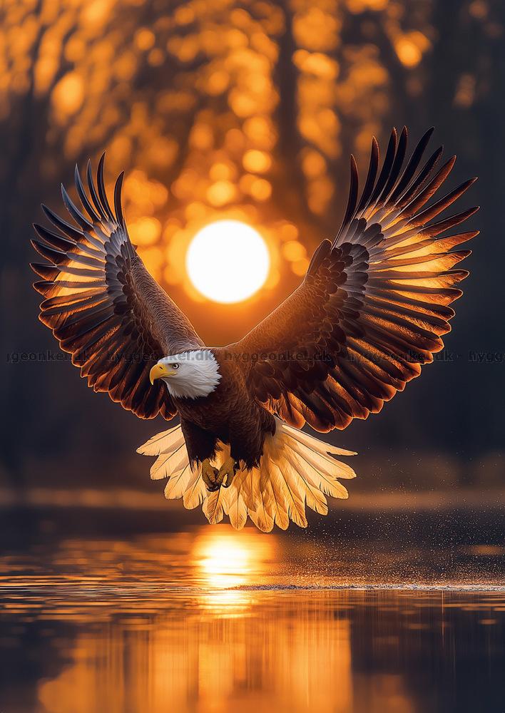 - Den majestætisk ørn svæver lavt over vandoverfladen, dens vinger er bredt udstrakte i en imponerende positur