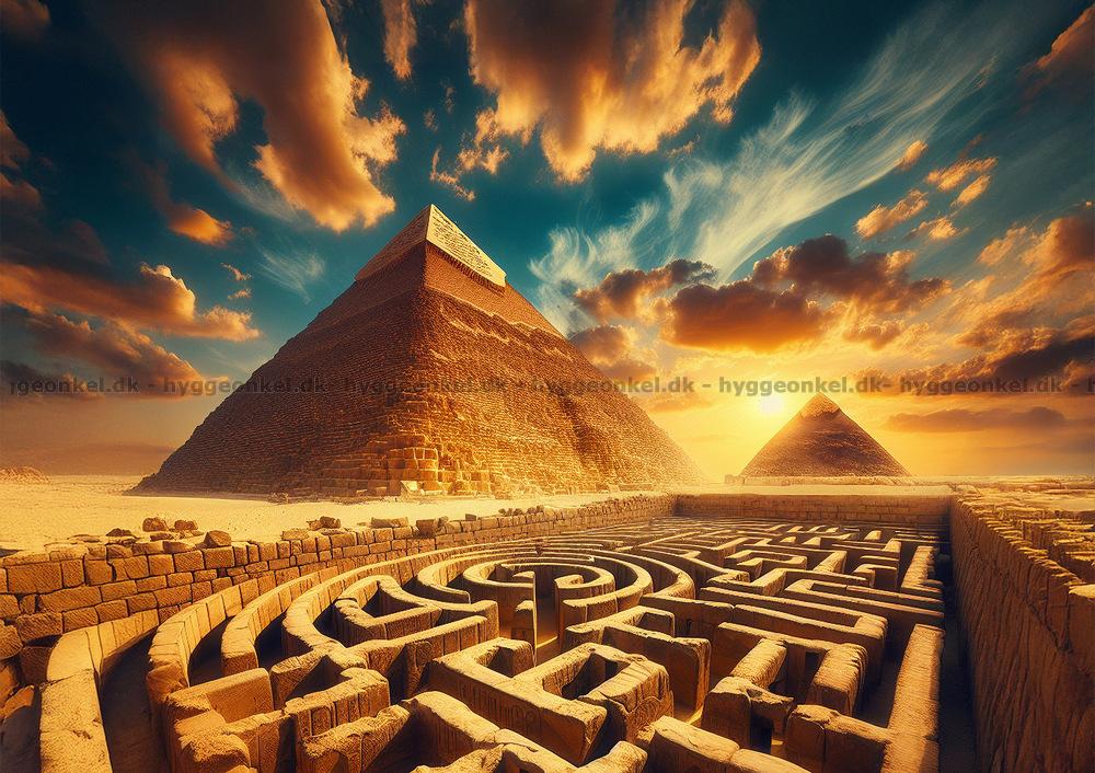 - Foran pyramiderne ses en indviklet labyrint, der er skåret ud i sandstenen