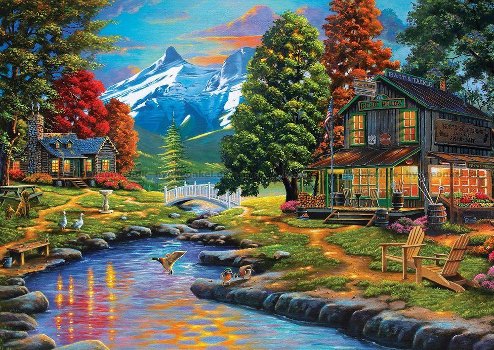 - Den stille flod snor sig forbi de grønne græsarealer og farverige træer i efterårsnuancer. Ved siden af floden ligger en hyggelig bjælkehytte