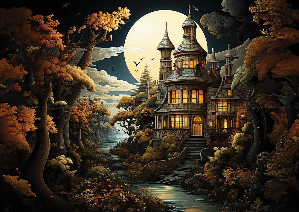 - En stor, lysende fuldmåne hænger lavt på himlen, og dens skær reflekteres i de omkringliggende træer og den stille flod, der snor sig gennem landskabet. Træerne omkring palæet er i varme efterårsfarver.