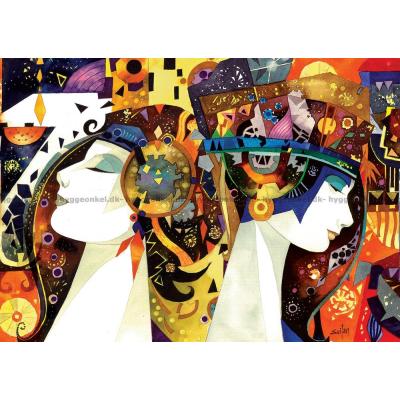 - To farverige ansigter omgivet af spændende mønstre og symboler