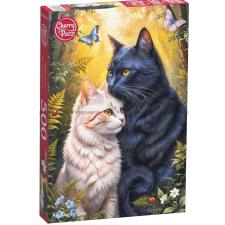 - o katte sidder tæt sammen i en skovlysning, omgivet af frodige planter og bløde solstråler. Den ene kat er sort med skinnende pels, mens den anden er lys med rødlige striber