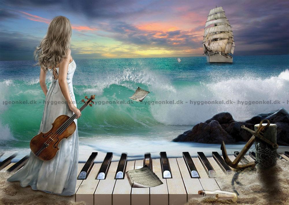 - Kvinden står med violinen i hånden. Hun står på et klaver, der er delvist begravet i sandet, mens hun kigger ud over havet