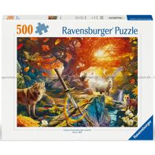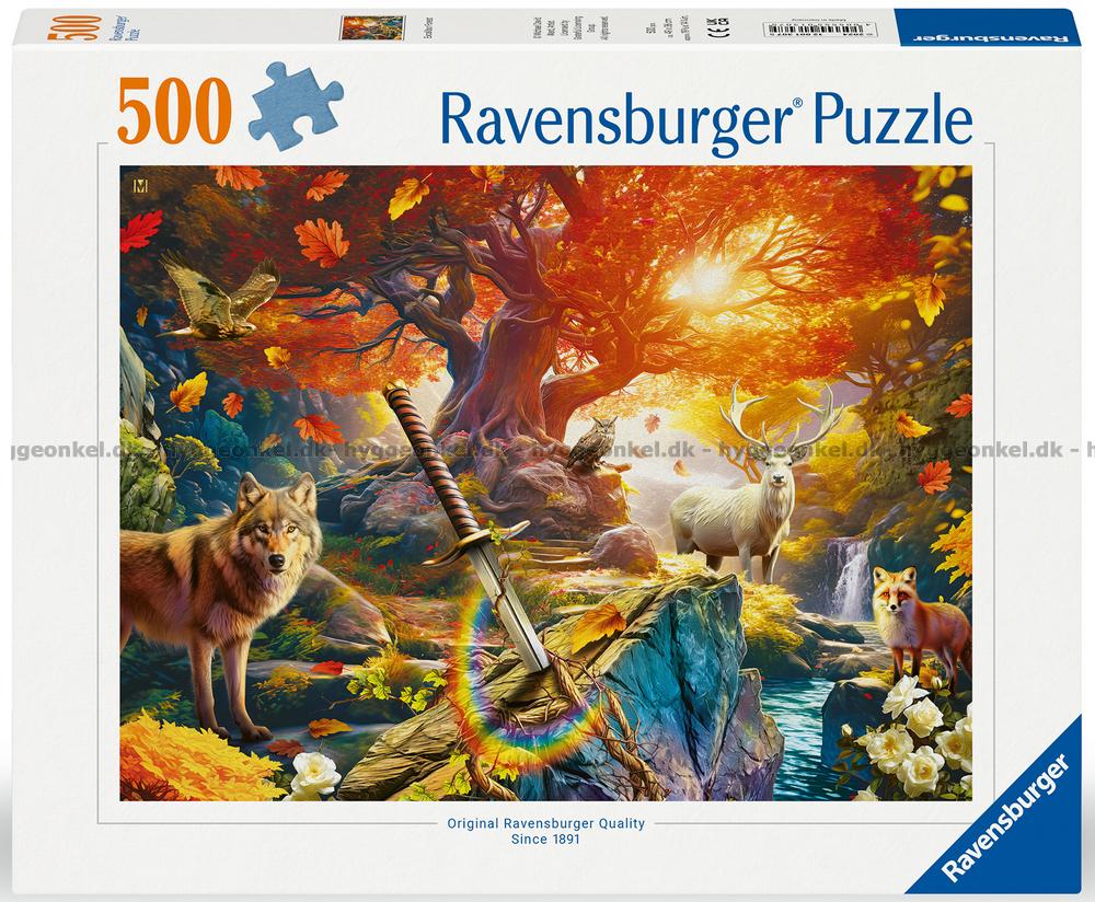 - Sværdet står fastgjort i klippen omgivet af en magisk skov i efterårsfarver