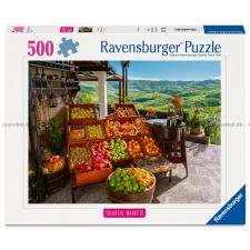 - Et farverigt frugtmarked med en betagende udsigt over grønne bakker i baggrunden