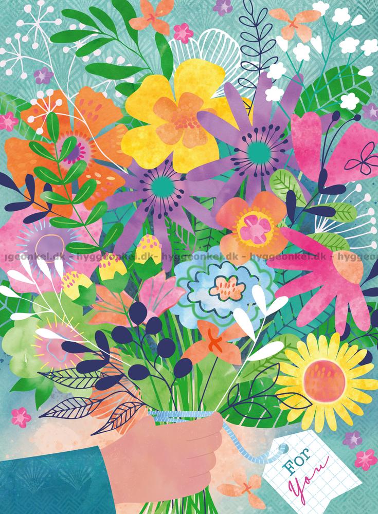 - Hånden rækker buketten frem sammen med kortet, hvorpå der står, at buketten er til dig